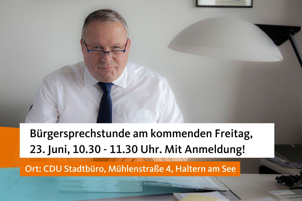 EINLADUNG ZUR BÜRGERSPRECHSTUNDE NACH HALTERN AM SEE: Am kommenden Freitag, dem 23. Juni, von 10.30 bis 11.30 Uhr, möchte Josef Hovenjürgen Sie zur Bürgersprechstunde nach Haltern am See einladen.